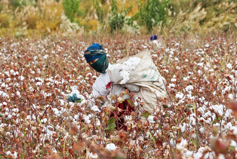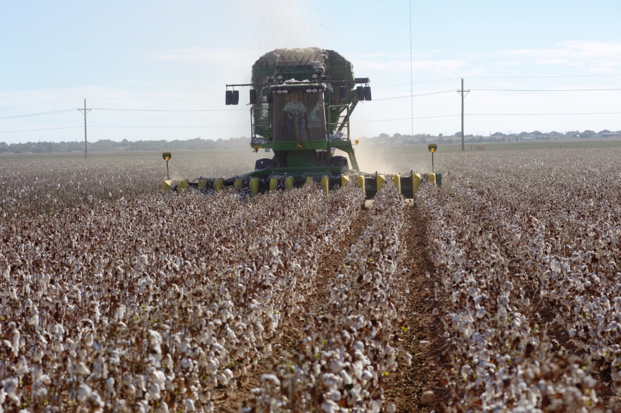 ※アメリカの農場での綿花の収穫の様子。アメリカの綿花栽培は大量生産のための効率性を重視して成長してきた。そのため「オーガニックコットン」などの割合はきわめて低い。