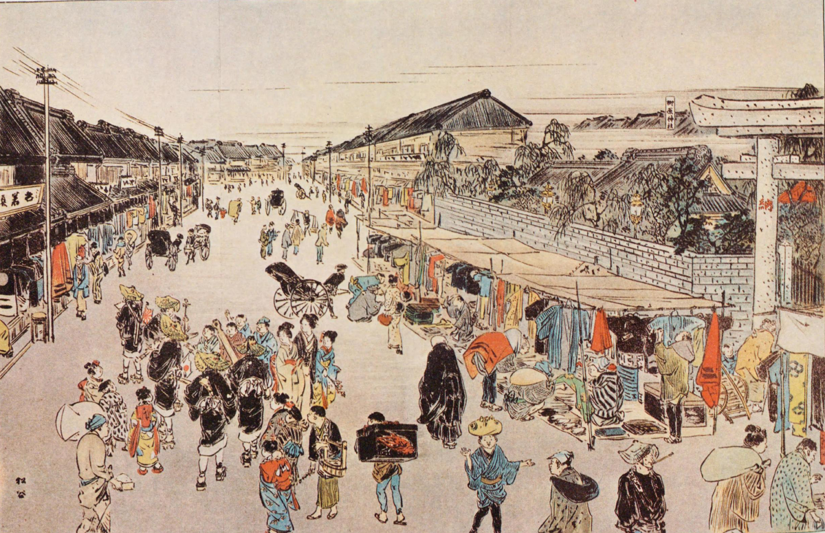 ※路の左右に古着商が並ぶ明治初期の東京の風景。現在も描かれた地域周辺は繊維関連の業者が多く、江戸の名残を伝えている。