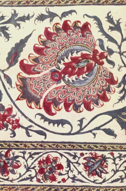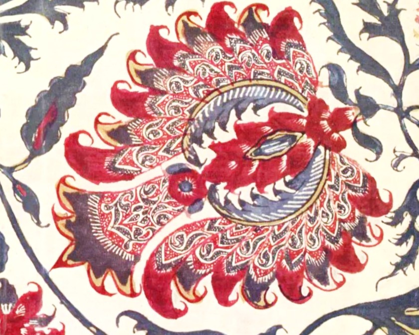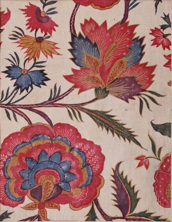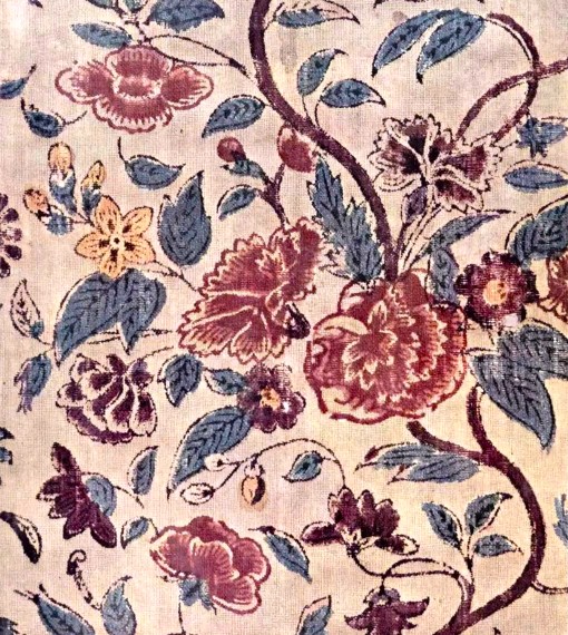 インド更紗、特に白地の花柄や唐草文様などのものは「ヨーロッパ風に見える」という言葉も耳にします。しかしこれはむしろ順序が逆で、「近世以降のヨーロッパの装飾がインド更紗の影響を受けている」という方が正しかろうと思います。