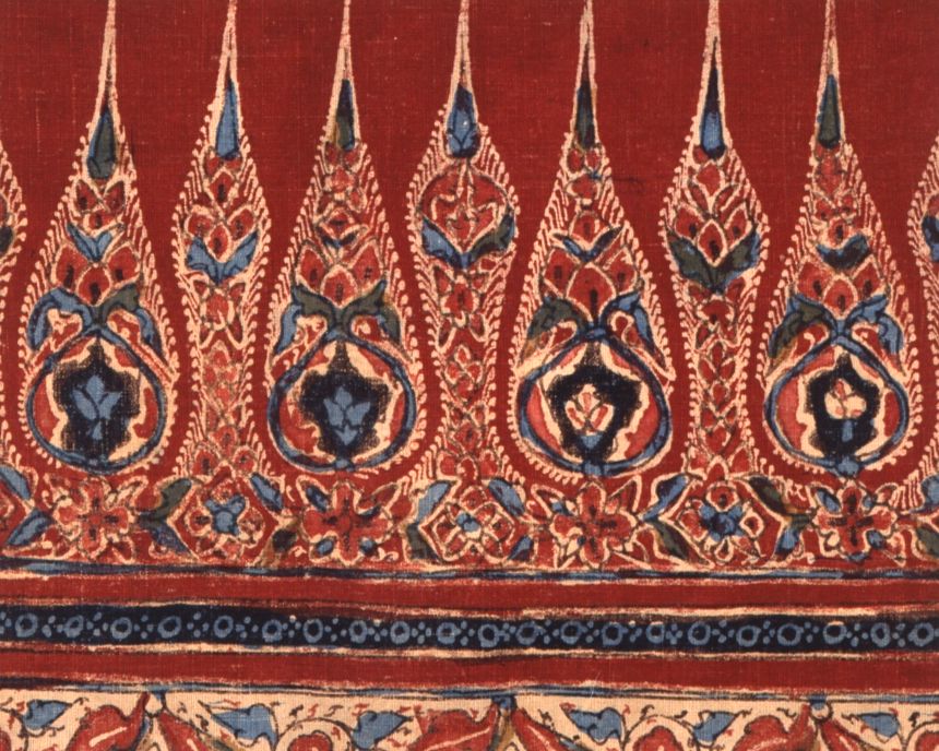 インド更紗は藍と茜を中心とした鮮やかな青と赤がとくに特徴的です。もちろんそれ以外の色も用いられますが、この華やかさと配色はなかなか他の場所ではみられないのではないでしょうか。