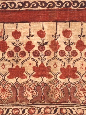 更紗の「祖」といえるインド。インドではきわめて古くから木綿布の染色が行われていたことがわかっています。少なくとも今から4000年以上前となるインダス文明の時代には鮮やかな染色布が作られていました。古くから金属媒染の技術が使われていたようで、色の鮮やかさ・落ちにくさから珍重されました。古代から既に盛んに輸出されていたようで、古代エジプトの遺跡でミイラを包む布として発見されたり、ローマ帝国が多く輸入していたという記録があったりもします。