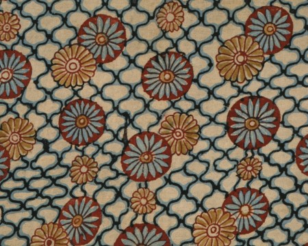 インドの更紗は主に、手描きと木版によって描かれます。カラムカリ(kalamkari ※kalam=ペン)と呼ばれる手描きや、木版を用いて染料や蝋、媒染剤等を使い分け、色とりどりの精緻な文様を生み出しました。