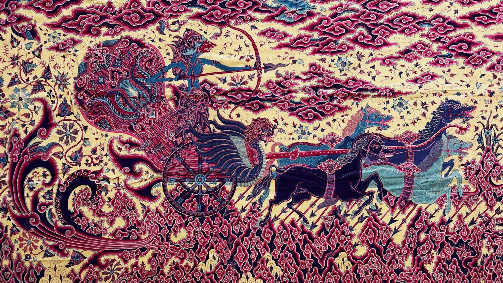 ジャワ北部・チレボンのバティック。インド神話『マハーバーラタ』を題材にしたワヤン・クリ(インドネシアの伝統的な影絵人形劇)を描いたもの。雲や「繧繝(うんげん)」彩色に中国文化の影響もみえる。(パブリックドメイン, Wikimedia Commons)