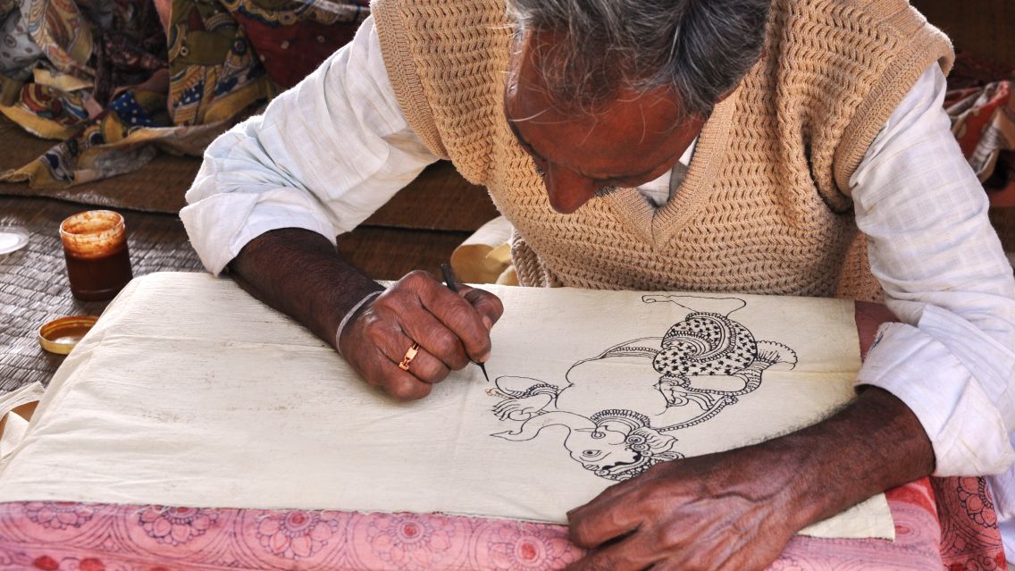 カラムカリの制作風景。ガネーシャの絵を手描きしているところ。(パブリックドメイン, Wikimedia commons)