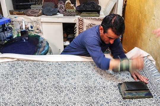 イランの古都・エスファハーンでの木版更紗の制作風景。ペルシャ語ではこうした更紗を「ガラムキャール(qalamkār)」といい、インドの手描き技法「カラムカリ(kalamkari)」と同語源です。「ペン仕事」を意味する語がイランでは木版の更紗にも使われているのは、かつては手描きでつくられていた名残といわれます。 (パブリックドメイン, Wikimedia Commons)