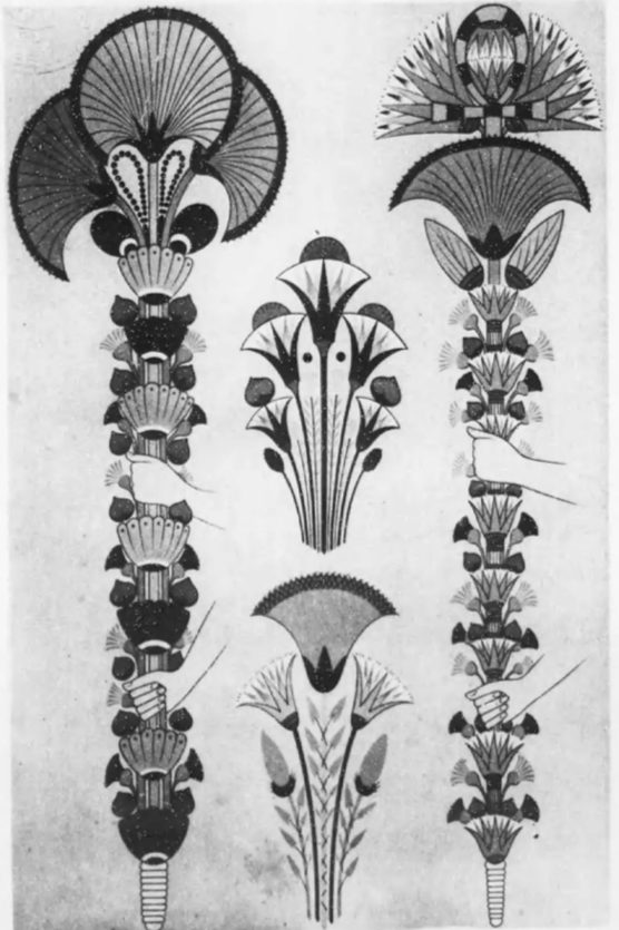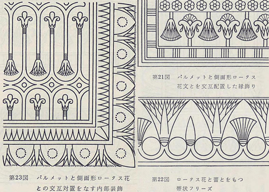 古代エジプトのロータス・パピルス文。(意匠美術写真類聚刊行会 編『意匠美術写真類聚 第2期 第6輯 埃及装飾美術意匠集』, 洪洋社, 大正13. 国立国会図書館デジタルコレクション)