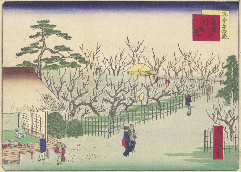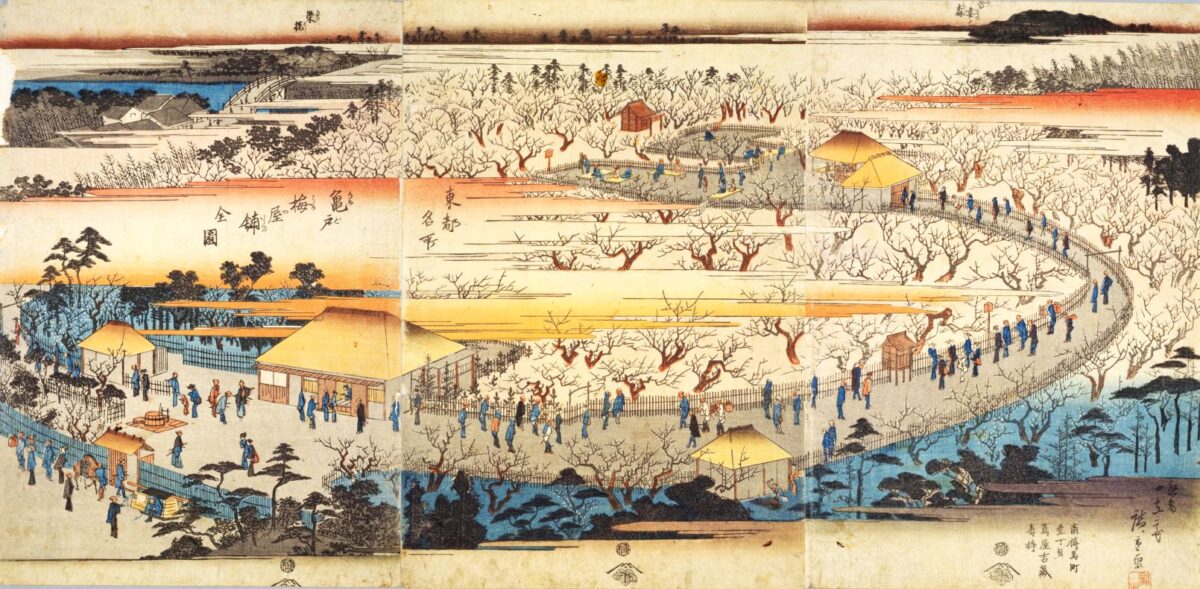 明治43(1910)年の大雨による水害で「臥竜梅」をはじめ梅の木のほとんどが枯れてしまった梅屋敷は、明治末には閉園してしまいました。そんな往時の賑わいを偲ぶかのように、亀戸天神には今も梅の木が並びます。非常に多くの浮世絵に描かれていることからも、人々に非常に愛されていたことがわかります。