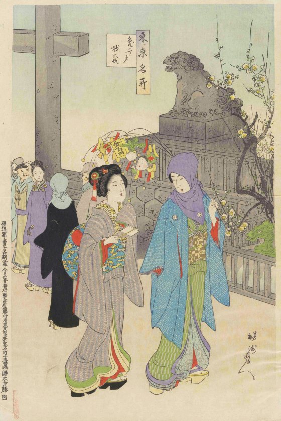 明治後期の作品。早春の亀戸天神の様子。右には梅の木が描かれています。