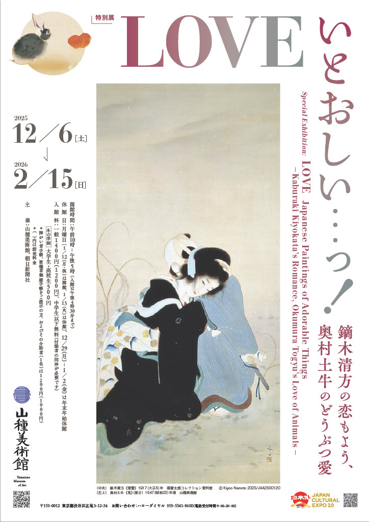 私たちの身の回りには、さまざまな愛の形があります。恋人同士の燃え上がるような愛、親子や夫婦など家族への愛、生まれ育った故郷への愛、身近な動物への慈しみの愛。また、最近よく耳にする「推し活」も、一つの愛の形といえるでしょう。この冬、山種美術館ではLOVEをテーマにした日本の近代・現代絵画を中心に取り上げ、ご紹介する特別展を開催します。