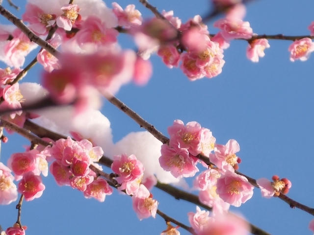 梅は早く咲き始めるため、咲いた後にも雪が降ることがありました。寒さに負けない力強さをたたえ、「雪中君子」という異名もあります。そんな梅の花に雪が積もった情景を表現しています。