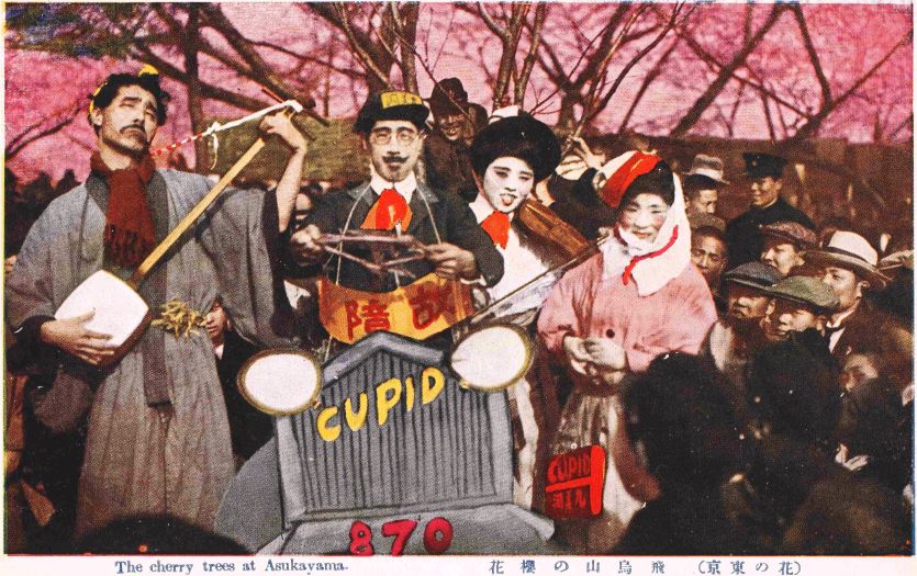 飛鳥山を写した明治時代の絵葉書(着色)。そこで興行をする芸人(楽団?)一座を撮った写真のようです。詳しいことはよくわかりませんが、なんだかとても楽しそうです。大勢で集まって賑やかに楽しむ、花見の様子がうかがえます。