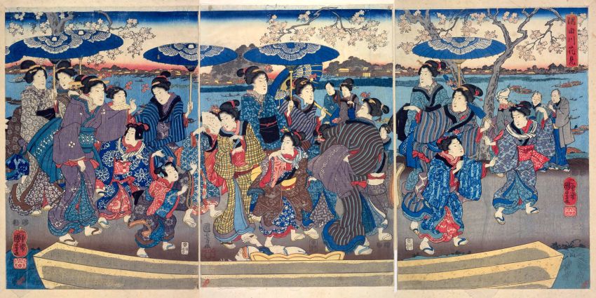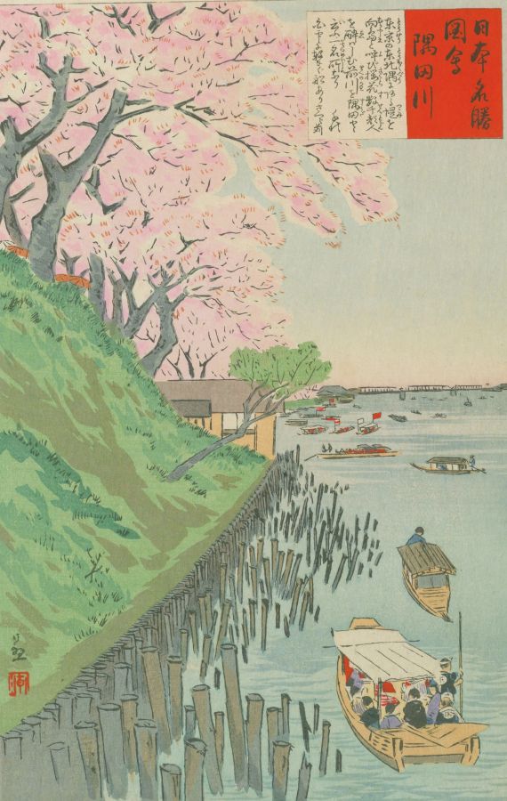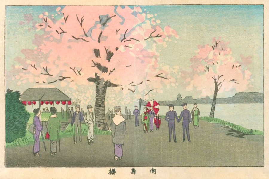 隅田川も桜の名所として栄えました。もともと江戸初期頃から桜が植えられていたようですが、特に8代将軍・徳川吉宗の時代には隅田川東岸の向島から千住までの一里(約4キロ)にわたって桜がさらに植えられました。こうしてできた隅田川東岸の一部は「墨堤(ぼくてい)」や「隅(墨)田堤(すみだつつみ)」などと呼ばれ、江戸の桜の一大名所として有名になりました。
