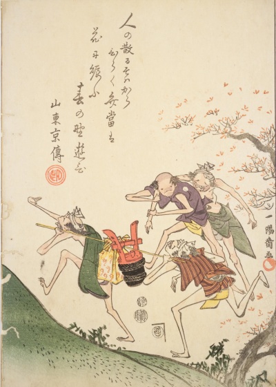 このように酒桶や重箱を棒にかけ、担いで花見へ向かうのが一般的だったといいます。軽快なタッチも相まって、春の陽気さや花見を楽しみにする人々の気持ちが伝わってきます。