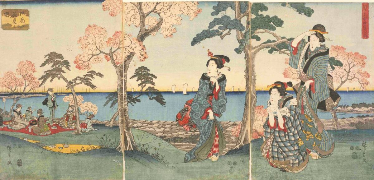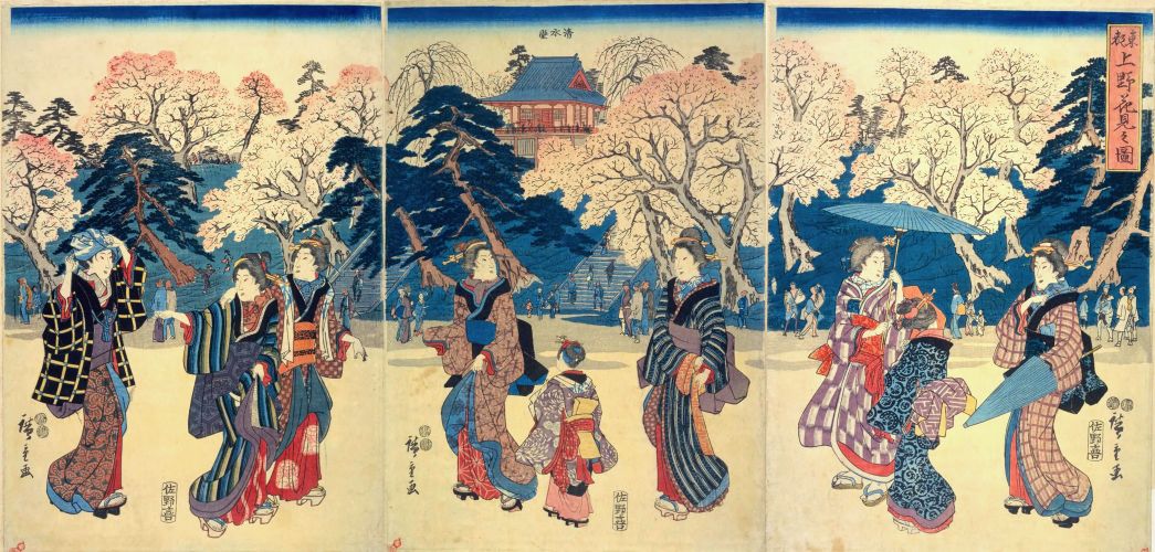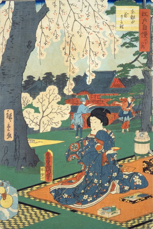 桜の樹の下で酒や食事を楽しむ女性。背後には遠目に上野・(東叡山)寛永寺の山門が描かれています。