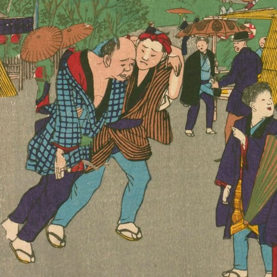 同じく酔いつぶれたと思しき男性と、それを支える男性が描かれています。明治時代の上野(旧・寛永寺)の情景を描いたもので、江戸時代の寛永寺では許されなかったであろう行為に時代の移り変わりが見て取れます。