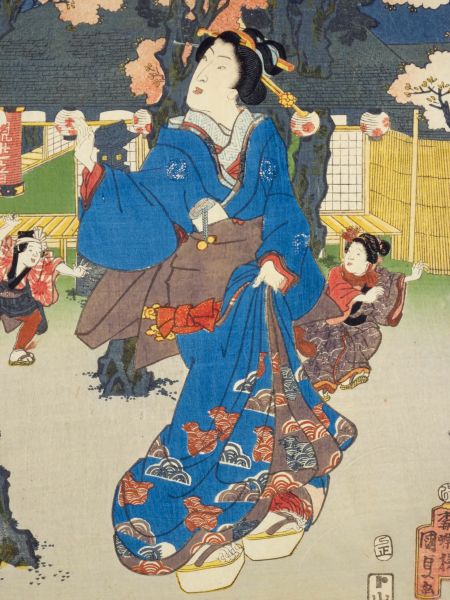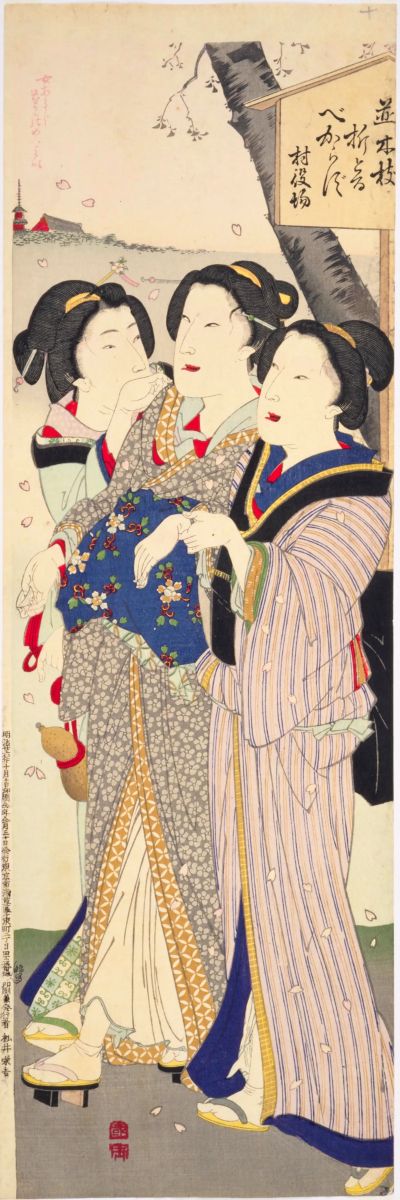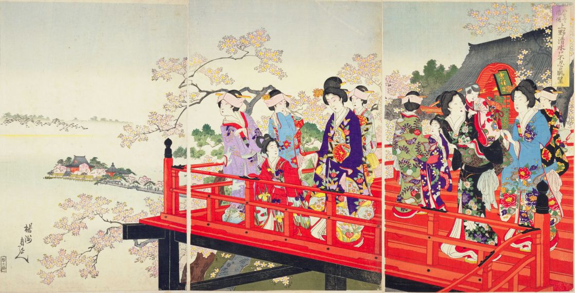 清水観音堂から不忍池を眺める花見の女性たちを描いています。江戸時代には禁制もあり、基本的にここまで華やかな振袖や小袖を着ることは(少なくとも原則の上は)庶民にはできなかったと思われます。明治後期の絵画ということもあり、時代の変化を感じさせます。