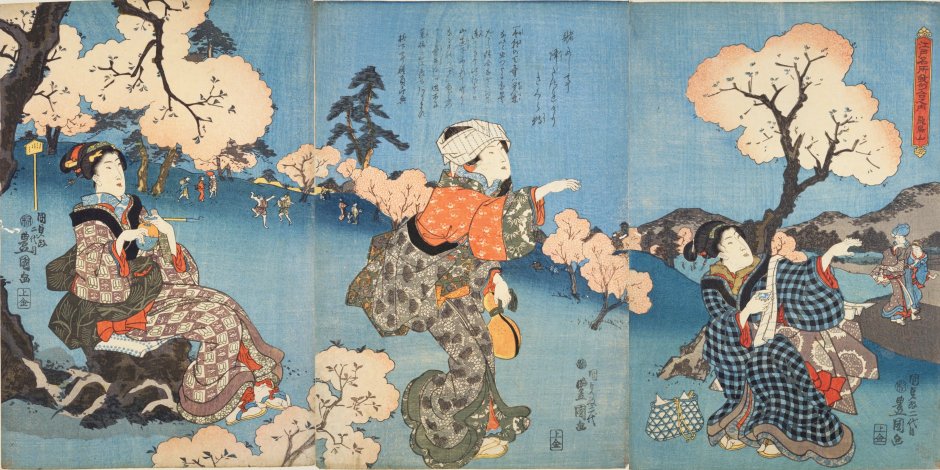 女性たちは「花見小袖」を仕立てて華やかに着飾って出かけ、みな弁当や酒を持参したり買ったりして大人数で宴会を催し、花はもちろんのこと、花見酒やどんちゃん騒ぎをして大いに楽しみました。