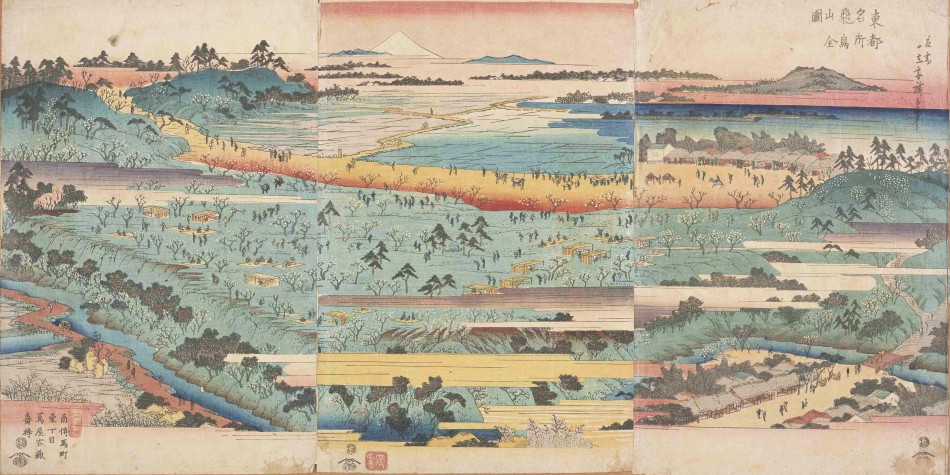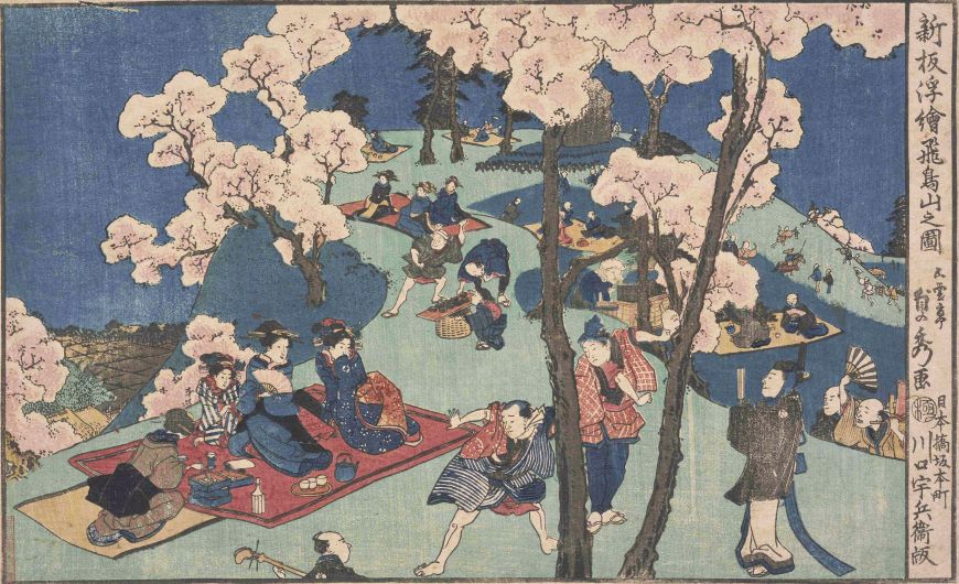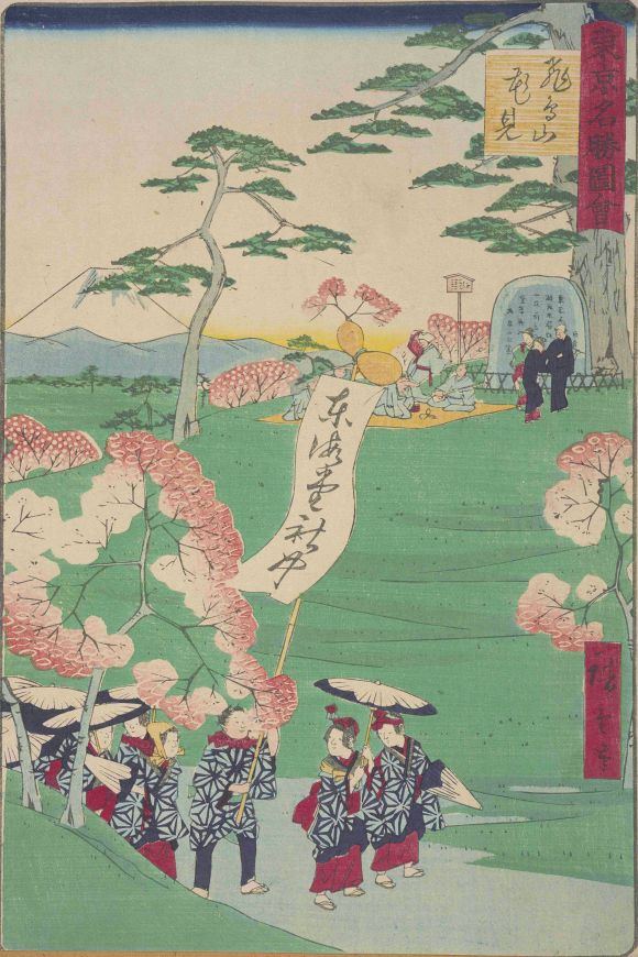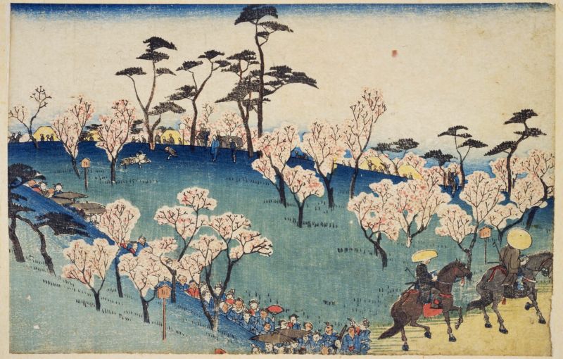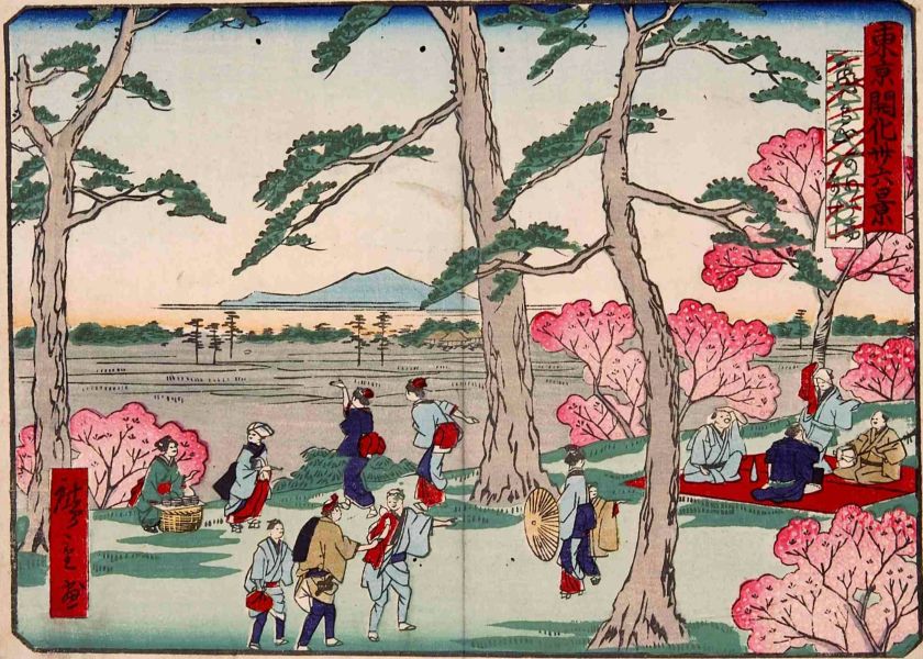現・東京都北区にある小さな山です。第8代将軍・徳川吉宗は飛鳥山に1200本あまりの桜を植え、さらにそれを人々に開放したことで、江戸近郊の行楽地となりました。江戸末期の行政区分においてはギリギリ江戸圏(?)に含まれていましたが、江戸中心市街からみれば北の郊外に位置する場所でした。