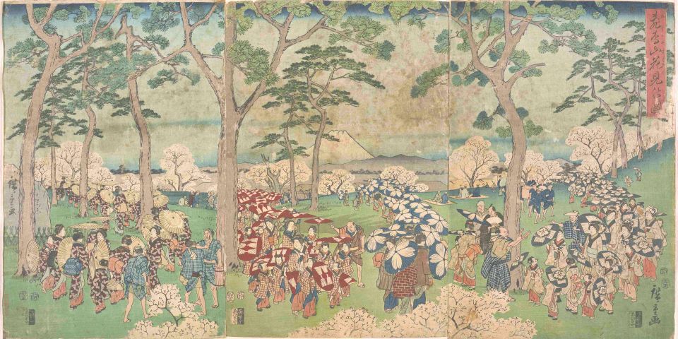 当時の花見の賑わいぶりがわかる浮世絵。軽食や弁当、酒が売られ、芸人らによる見世物も行われています。「花より団子」という言葉が生まれるのも理解できますね。