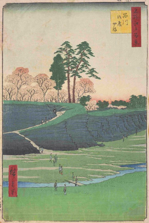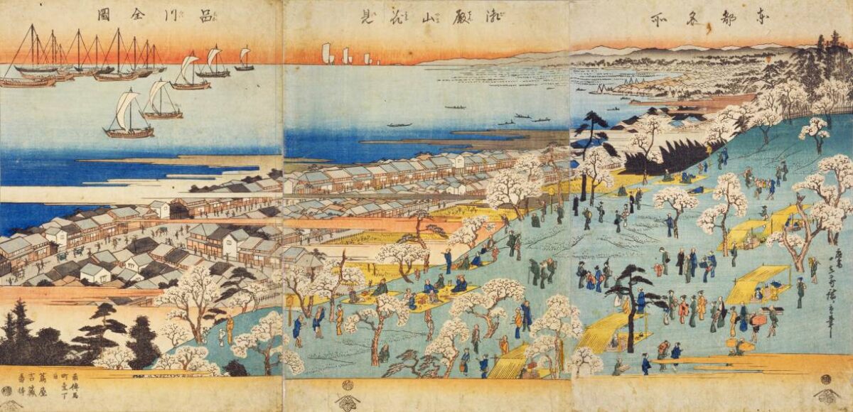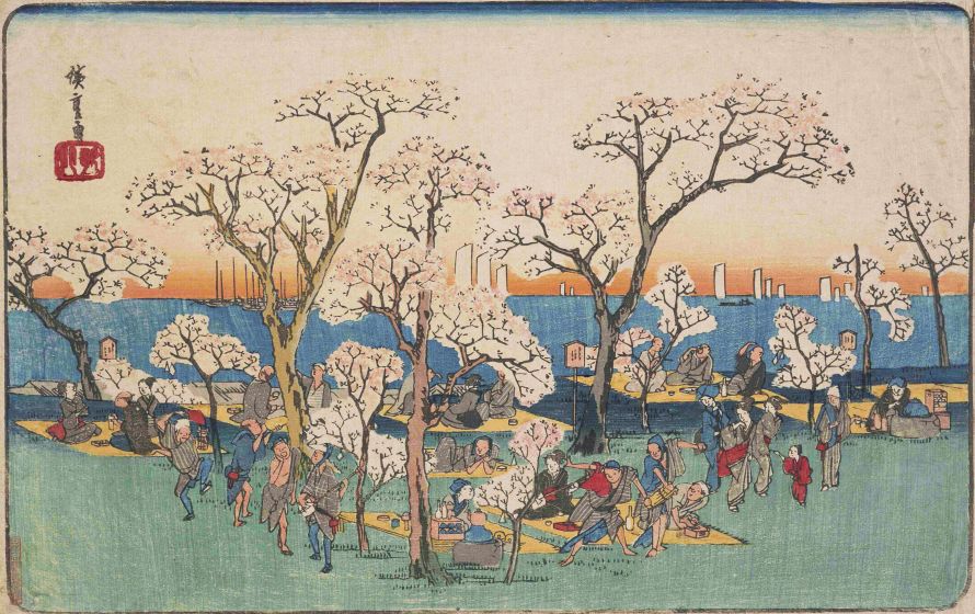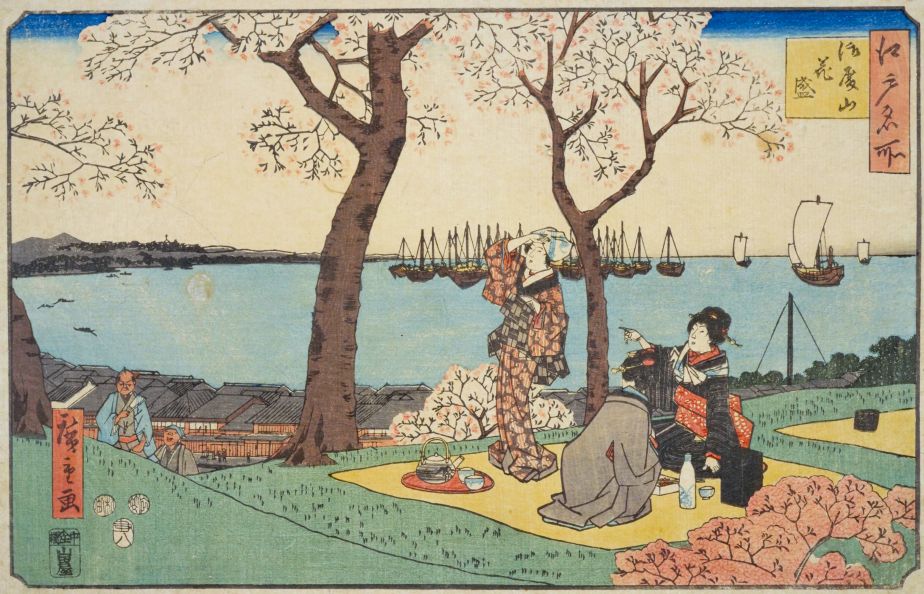 御殿山は、江戸の南端に位置する品川宿近くにあった山で、徳川将軍家の「品川御殿」が置かれた山であったことからそう呼ばれるようになりました。同じく第8代将軍・吉宗の時代に桜が多く植えられ、江戸近郊の桜の名所として有名になります。桜をはじめとする山の草花に加えて、品川沖の海を見渡すことができた御殿山の風景は、さぞ美しかったことでしょう。