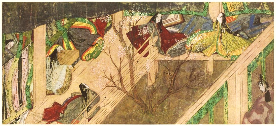 『源氏物語』第44帖「竹河」。桜の樹を賭けて碁に興じる姫君たちが描かれています。春らしい装束の襲(かさね)の色目も綺麗です。