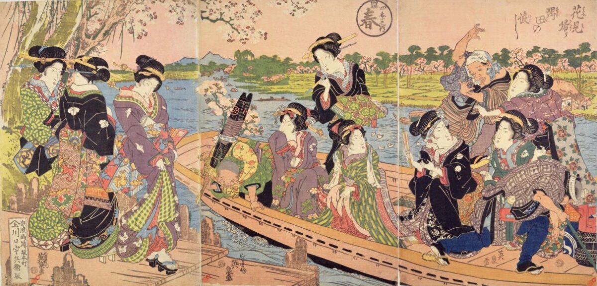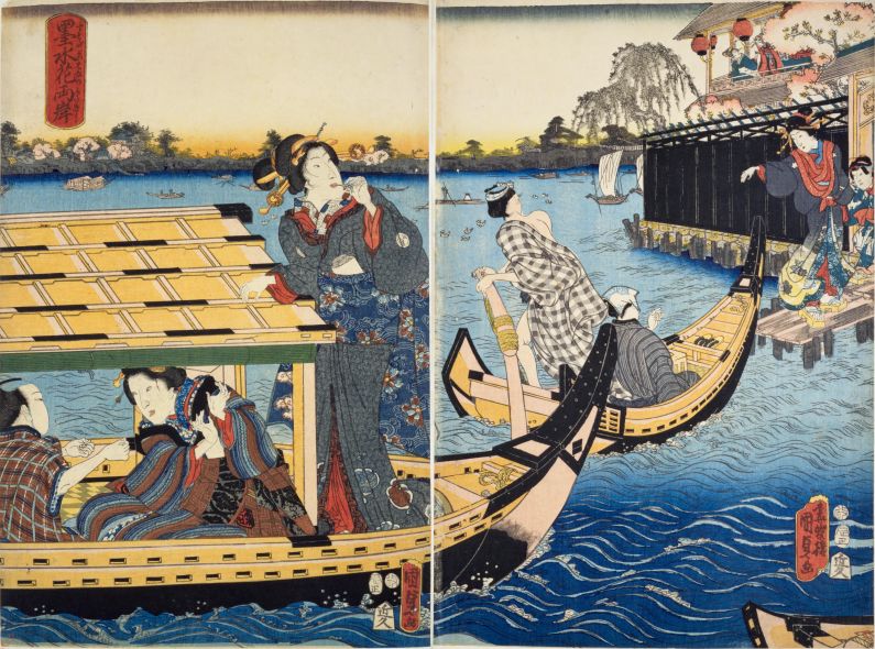 当時はちょっとした旅気分を味わえる江戸近郊のスポットも人気であり、渡し舟で隅田川を越えた向こう、「向島」はその一つです。この辺りも当時の行政上「江戸」の範囲内ではあるのですが、「川を渡る」、つまり「境界を越える」という行為ゆえでしょうか。