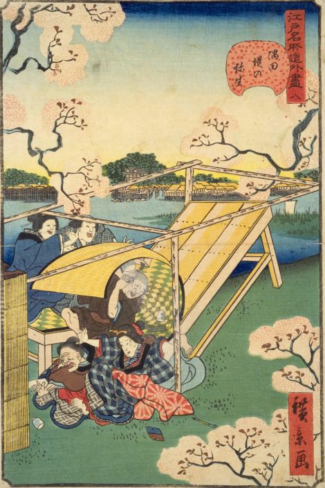 茶屋の縁台がひっくり返ったシーンをコミカルに描いた浮世絵です。背景には隅田川が描かれています。